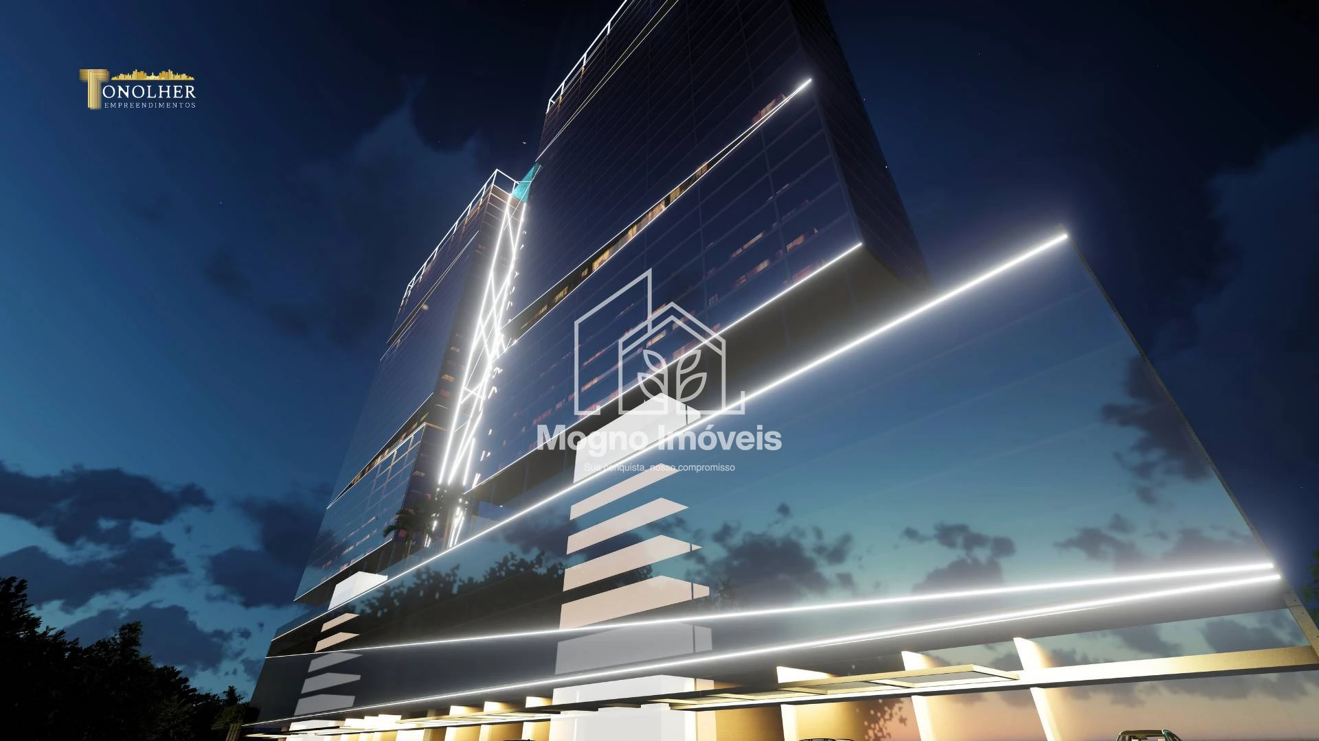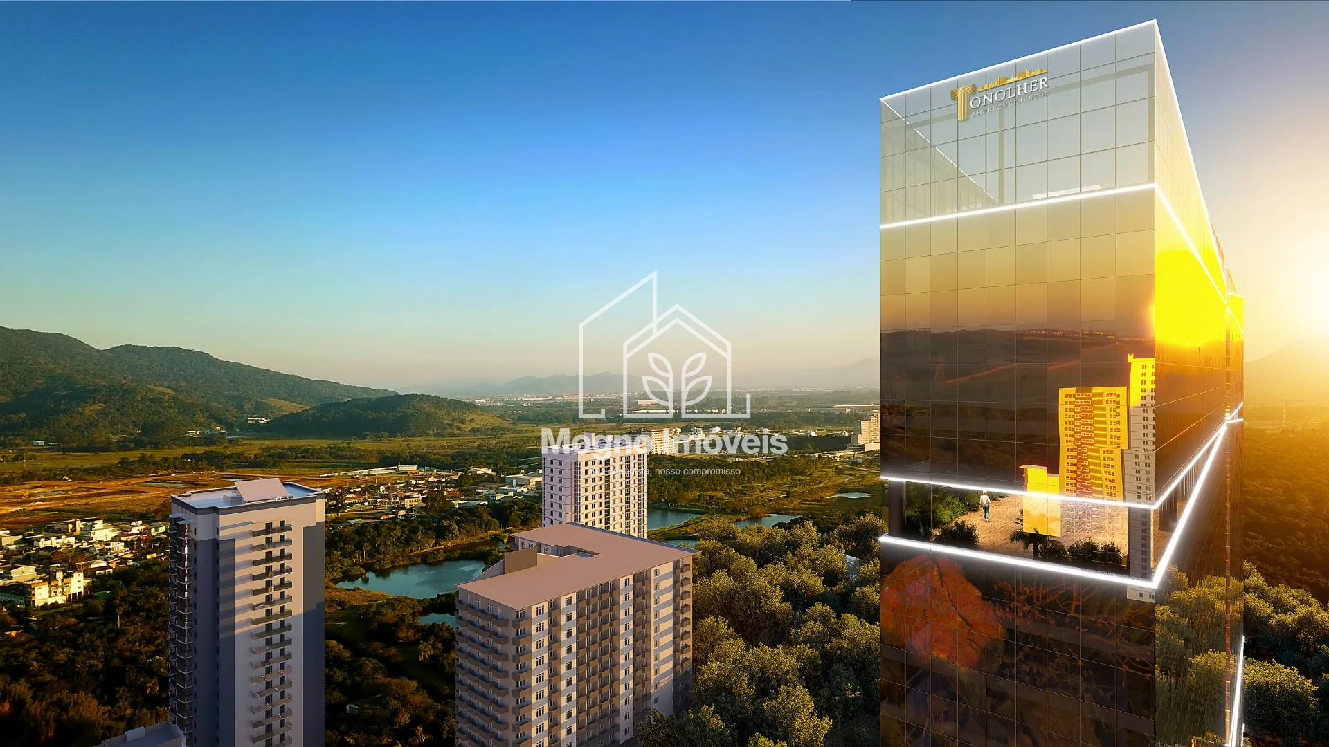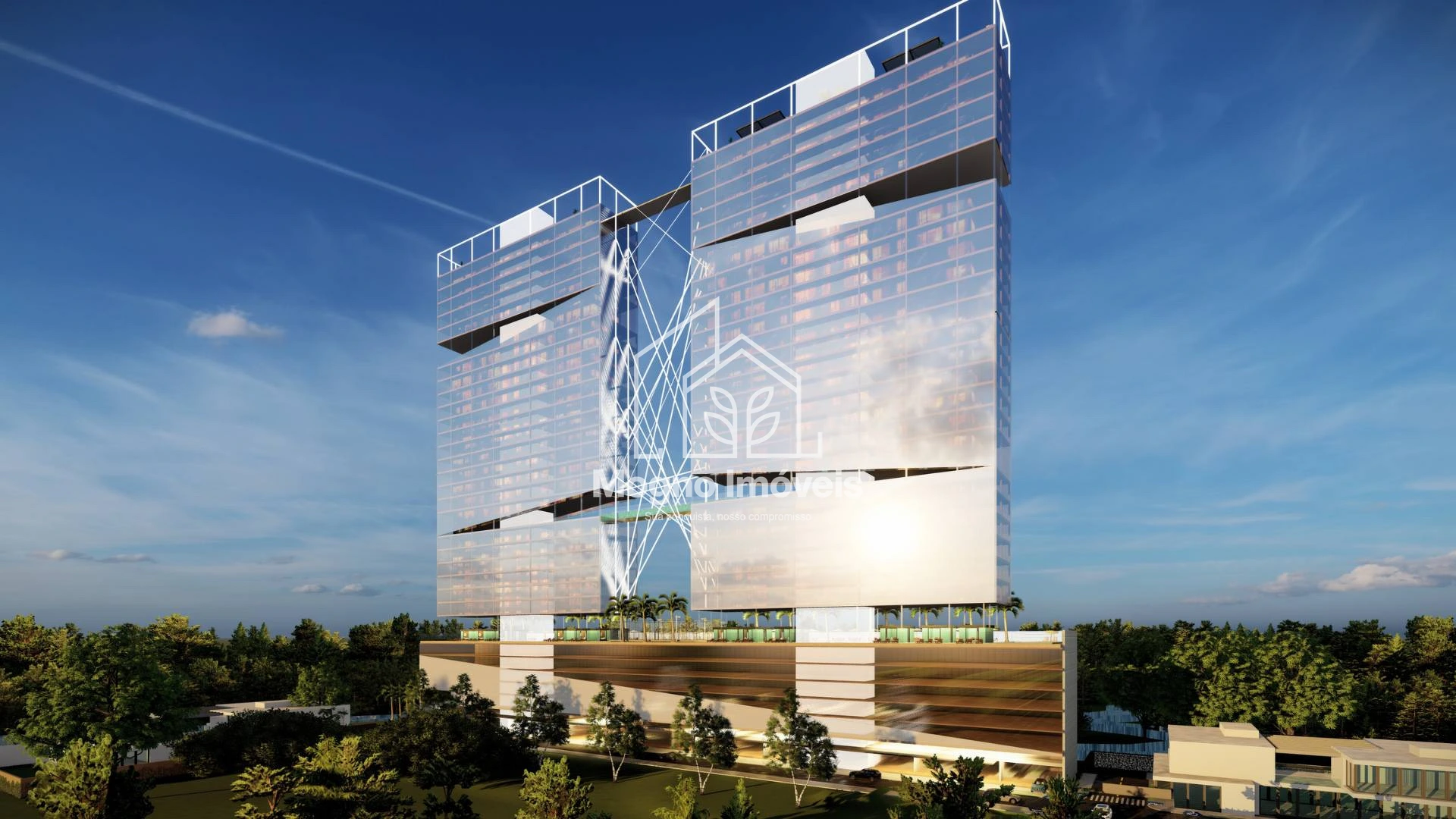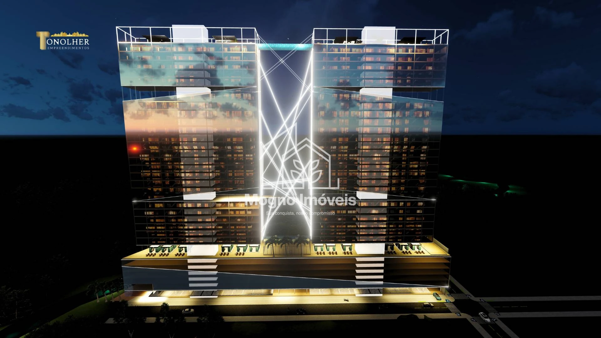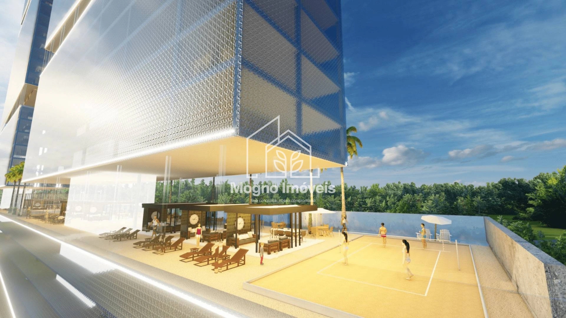 O Sky Marine Towers oferece studios e apartamentos de 2 suítes, com arquitetura moderna, revestimento em pele de vidro bronze, acesso por reconhecimento facial, coworking, sala de cinema, boliche, piscinas com borda infinita, praça de fogo, pub esportivo, e muito mais.