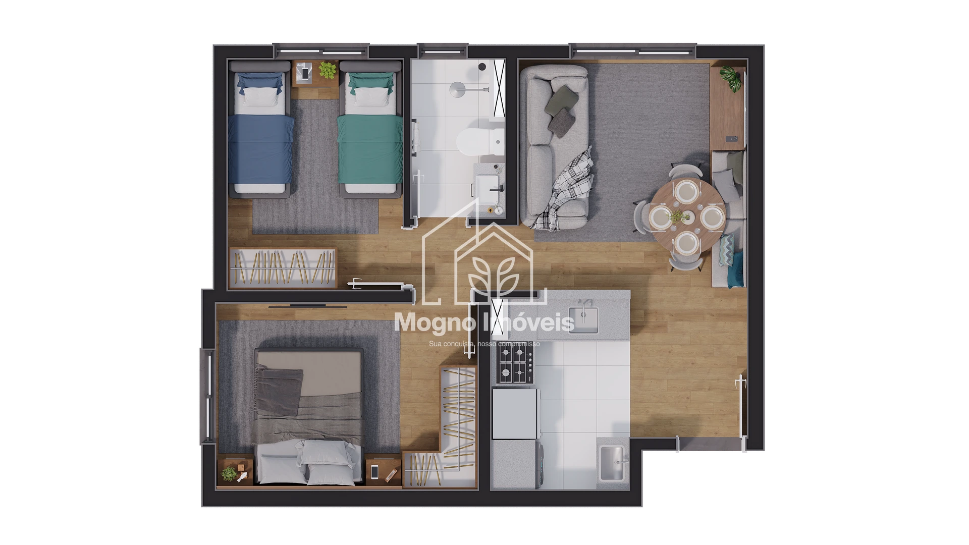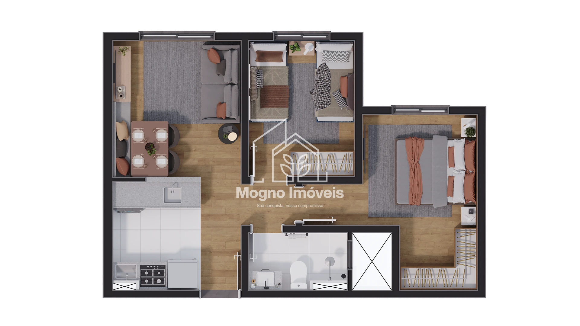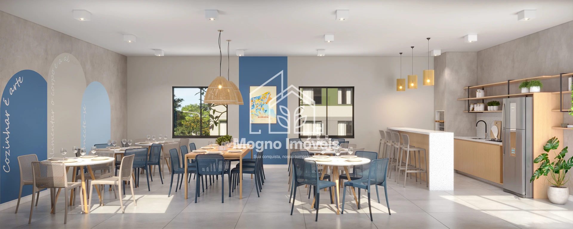 Com arquitetura contemporânea e funcional, os apartamentos de 2 quartos (com metragens de 40,47m² a 42,77m²) foram pensados para valorizar luz natural, ventilação e o aproveitamento dos espaços, tornando cada ambiente mais acolhedor e prático.